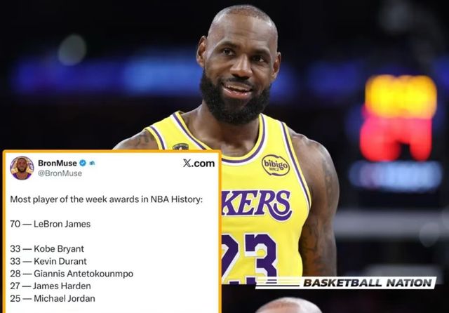 凭借这次周最佳,詹姆斯职业生涯周最佳次数来到70次,高居历史第一。