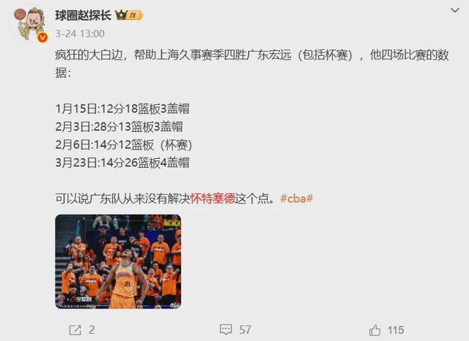 过去四场白边对阵广东队的比赛,都在禁区展现出了无比强悍的统治力,具体如下: