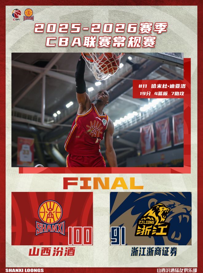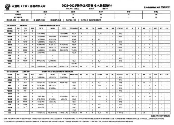 北京时间2026年4月15日19:35,2025-2026赛季常规赛第39轮继续进行,山西汾酒主场迎战浙江浙商证券。两队历史上共交手52次,山西汾酒18胜34负。上赛季两队交手4次,山西汾酒2胜2负;本赛季两队交手1次,山西汾酒0胜1负。本场比赛,山西队命中率偏低,对重点人限制不够好,但是篮板球拼抢积极,比对手多抢了19个,全队团结一致,靠积极拼搏的精神捍卫主场,艰难取胜,最终全场比赛结束,山西汾酒100:91战胜浙江浙商证券。