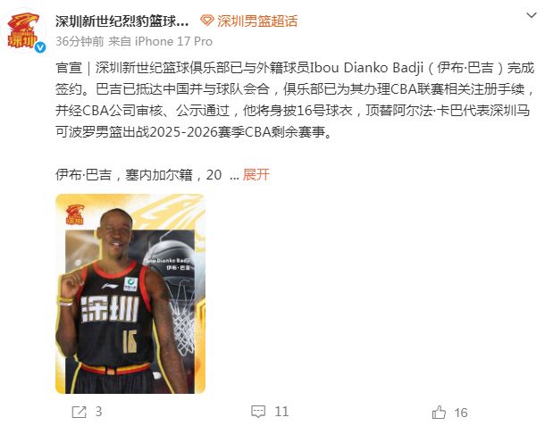 深圳新世纪篮球俱乐部已与外援伊布·巴吉完成签约,巴吉已抵达中国,并与球队会合,俱乐部已为其办理CBA联赛相关注册手续,并经CBA公司审核、公示通过,他将身披16号球衣,顶替卡巴代表深圳马可波罗男篮出战2025-2026赛季CBA剩余赛事。