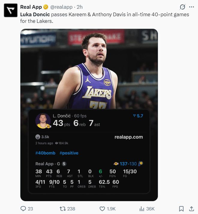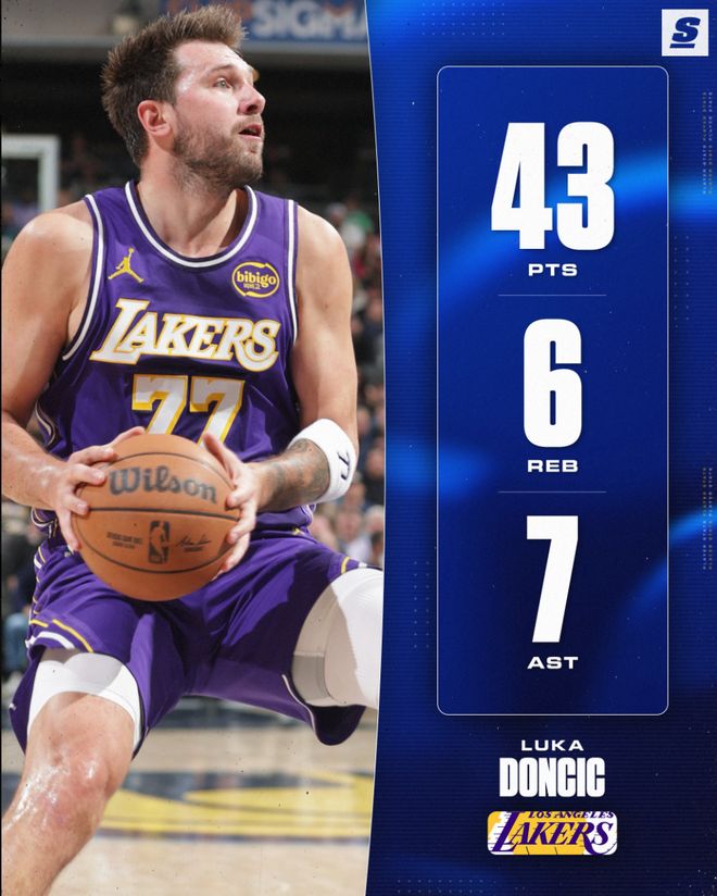 湖人在对阵步行者一战中,卢卡-东契奇再度斩获43+7+6的数据,全场比赛37分钟,30中15,三分11中4,罚球10中9,拿到43分7助攻6篮板1抢断,命中率50%,美中不足是有5个失误,此役东契奇又一战创造多项纪录。