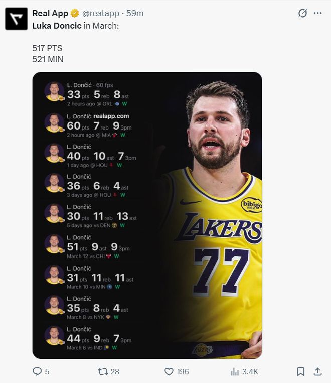 整个三月份东契奇出战了521分钟拿到517分,这个得分效率实在是太过于惊人了,目前东契奇场均33.6分也是联盟的得分王。