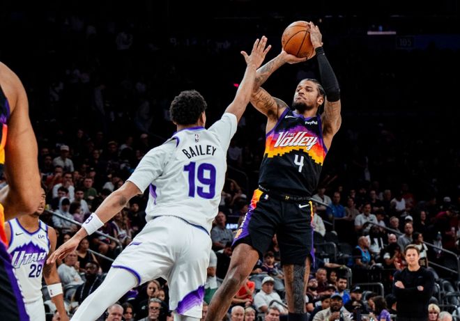 太阳上一场主场123-125惜败掘金,爵士过去4场遭遇4连败,本赛季前两次交锋双方各取一胜。本场太阳缺少狄龙、马威与科菲,爵士缺少凯斯勒、努尔基奇、贾伦与马尔卡宁。首节前4分多钟,双方交替领先缠斗至太阳16-15领先,太阳一波8-0攻势扩大9分优势。哈克莱斯上篮追分,太阳内外开花一波13-0攻势,已经扩大37-17领先20分优势。爵士略有反扑追分,首节比赛结束太阳39-21领先爵士18分优势。