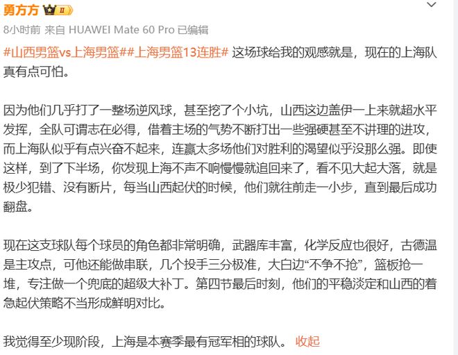 赢球的上海拿到第13场连胜,继续高居联赛榜首,这场胜利对于上海队来说也是相当提气的,赛后媒体人勇方方更是直言:这场球给我的观感就是,现在的上海队真有点可怕,至少现阶段,上海是本赛季最有冠军相的球队。