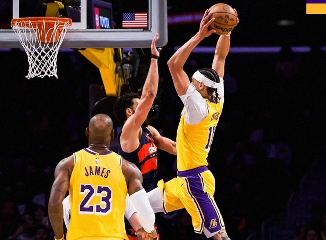 进入下半场,艾顿暴扣,里夫斯终于中投命中,湖人最多领先24分!中段里夫斯和拉拉威亚轮流上篮,分差在20分左右徘徊。但后半段风云突变,奇才不断冲击湖人篮下,配合特雷约翰逊的三分球,一波流追到只差10分!肯纳德三分止血,布朗尼上篮不中,好在老詹和肯纳德不断抢分,三节打完时,湖人91-77领先奇才。决战第四节,海斯上篮打成2+1后,老詹追身三分再中,分差到20分,奇才又叫暂停。暂停回来海斯继续吃饼,甚至还命中一记接球三分,表现确实太离谱了,百发百中!