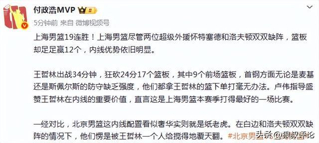 一经对比,北京男篮这内线配置看似奢华实则就是纸老虎。在白边和洛夫顿双双缺阵的情况下,他们愣是被王哲林一个人给搅得地覆天翻。