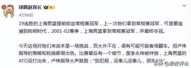 今天这场对他们来说本是一场挑战,双大外不在,很有可能客场翻车。但卢伟指导的策略和轮换都很出色。比赛最后有一个细节,偰李永炜被绊倒,上海男篮的ATO没打出来,卢伟指导大声鼓励:“别犯规,没事儿没事儿,领先5分”。