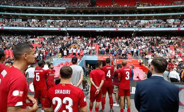 (克洛普带领利物浦球员一起观看曼城社区盾杯捧杯仪式)