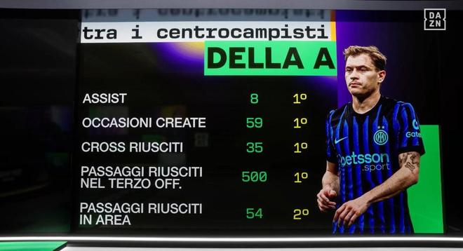根据DAZN的统计,巴雷拉本赛季在意甲8次助攻、创造59次机会、完成35次成功传中以及完成500次进攻三区内的传球均位列联赛同期所有中场球员的第一位。此外,巴雷拉还有54次传至禁区内的成功传球,这位列联赛同期所有中场的第二位。