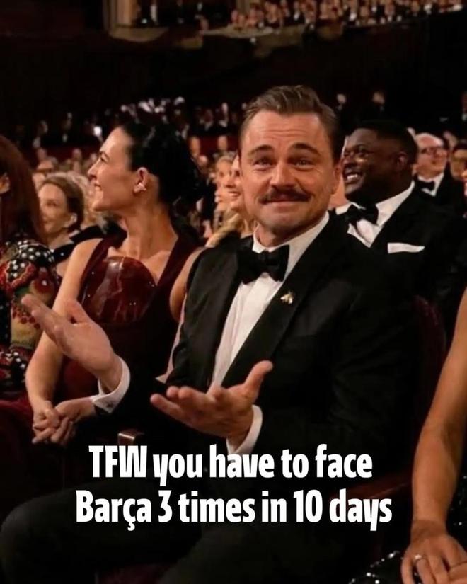北京时间3月19日凌晨,2025/26赛季欧冠联赛淘汰赛次回合上演一场焦点战。西甲床单军团马竞客场2-3不敌热刺,但仍以总比分7-5顺利晋级八强。赛后,马竞官方社媒晒出了一张小李子的摊手表情包,并写道:“当你10天内要面对巴萨3次时。”很显然,这是一个让床单军团痛并快乐着的结果。