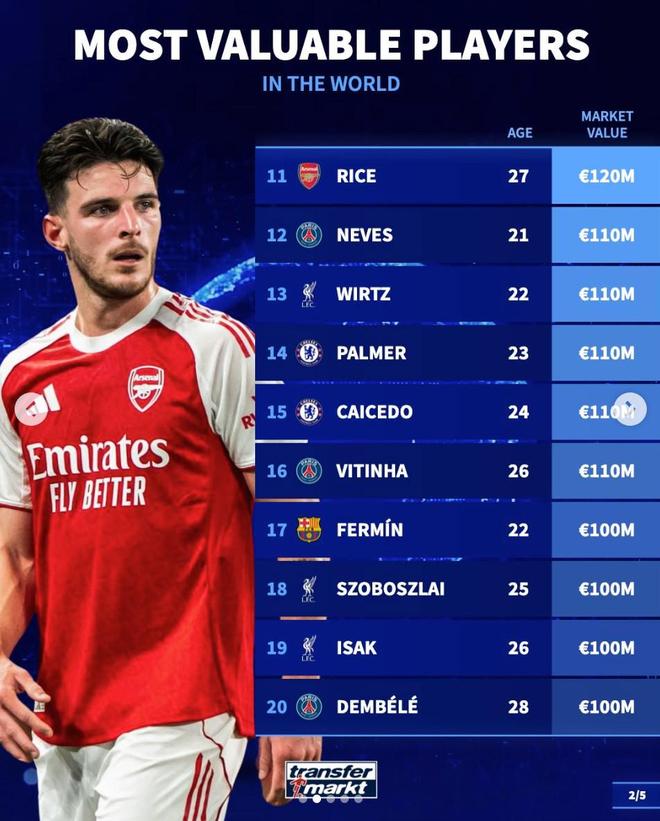 11. 赖斯(阿森纳)1.2亿欧元
