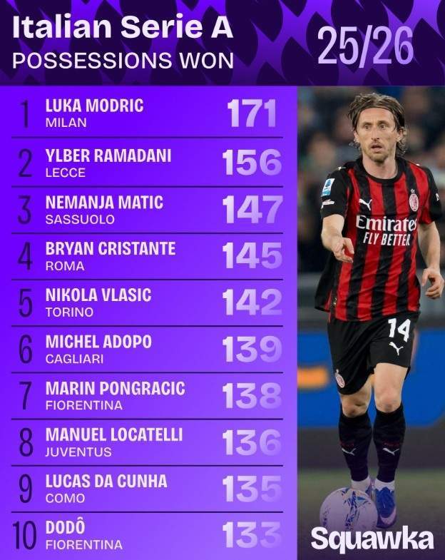 足球数据网站Squawka统计本赛季至今意甲球员夺回球权排行榜,40岁莫德里奇171次第一,马蒂奇第三。