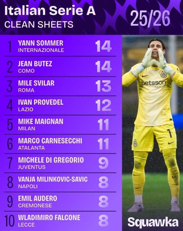 足球数据网站Squawka统计本赛季意甲门将零封榜,索默14次第一,迈尼昂第五,迪格雷戈里奥第七。