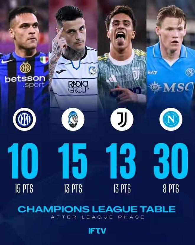不只是国家队,意甲俱乐部的欧战成绩同样江河日下。本赛季,意甲4支欧冠球队只有亚特兰大一队打进十六强,但也就此止步;国米、尤文在附加赛中分别不敌博德闪耀和加拉塔萨雷而无缘十六强,那不勒斯更是连附加赛的线都没碰到,小组赛直接出局了!